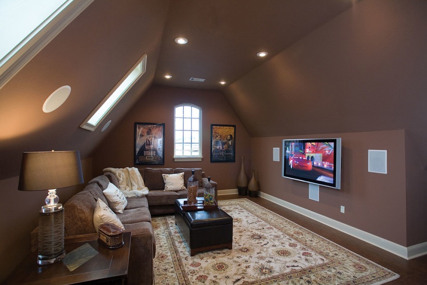 В мансарде также можно обустроить домашний кинотеатр, бильярдную, кальянную, малую гостиную и даже небольшой тренажерный зал. Если места много, можно спланировать сразу несколько сценариев досуга.