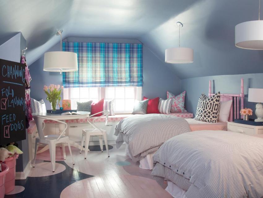 - Можно придумать необычное оформление мансардных стен, например, в красочных оттенках, контрастирующих с окрасом потолка или пола.