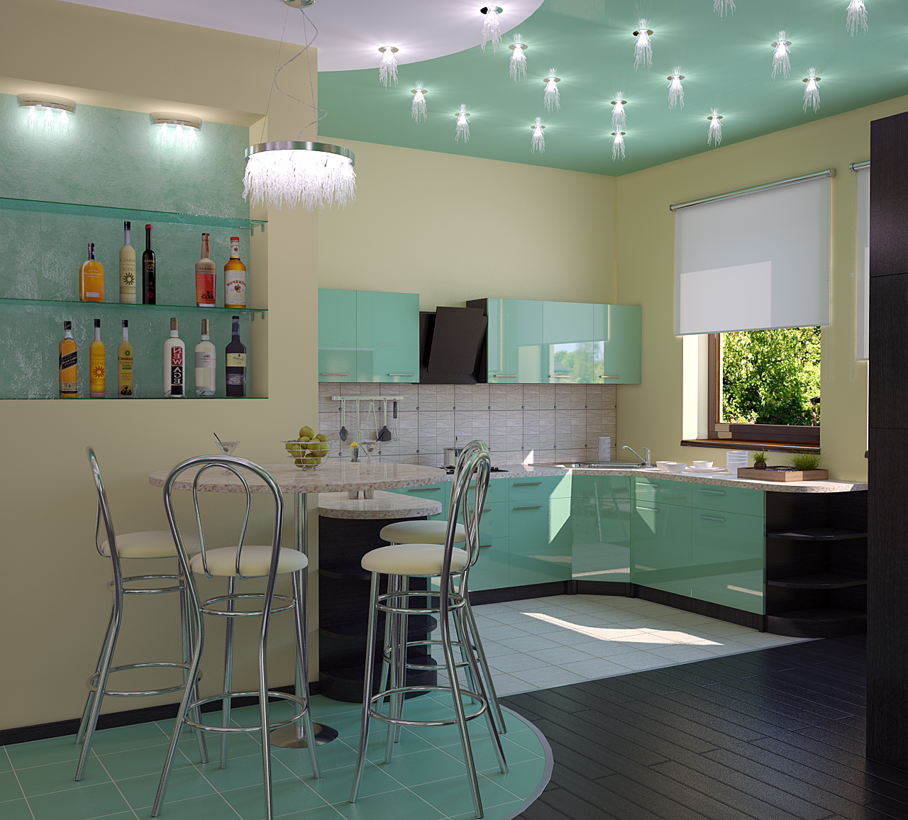 Над столовой зоной нужно создать мягкое и уютное освещение, располагающее к приятным семейным посиделкам. Лучше располагать обеденный стол около окна, чтобы как можно лучше использовать естественное освещение. В плане искусственного освещения отлично подойдет потолочный светильник с регулируемой высотой подвеса, причем висеть он должен не в центре кухни, а прямо над столом. Можно предусмотреть несколько таких небольших светильников. Если такой вариант не по душе, то можно использовать настенные светильники, а если площадь кухни позволяет, даже напольные. Также столовую зону можно выделить точечными светильниками, встроенными в потолок, а многоуровневый потолок – вообще прекрасная идея, ведь он визуально разделит пространство на зоны.
