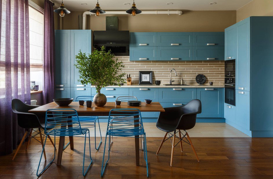 Теплые оттенки – желтый, коричневый – добавят нотки мягкости и уюта, ассоциируясь с лучами заходящего солнца. Холодный зеленый придает строгости и чистоты, теплый – смягчит эти ощущения. Бодрый и праздничный красный зарядит энергией и повысит настроение, поэтому его повсеместно используют в кухнях. Голубой и синий как цвета воды наиболее выигрышно смотрятся в ванных комнатах. Всегда на пике популярности черный и белый – цвета модерна и минимализма.