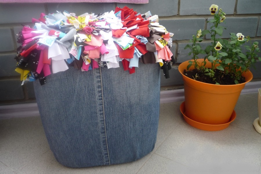 При оформлении изделия в таком стиле можно взять старые джинсы и разделить их на небольшие кусочки. К чехлу можно присоединить небольшой кармашек для мелочей. |