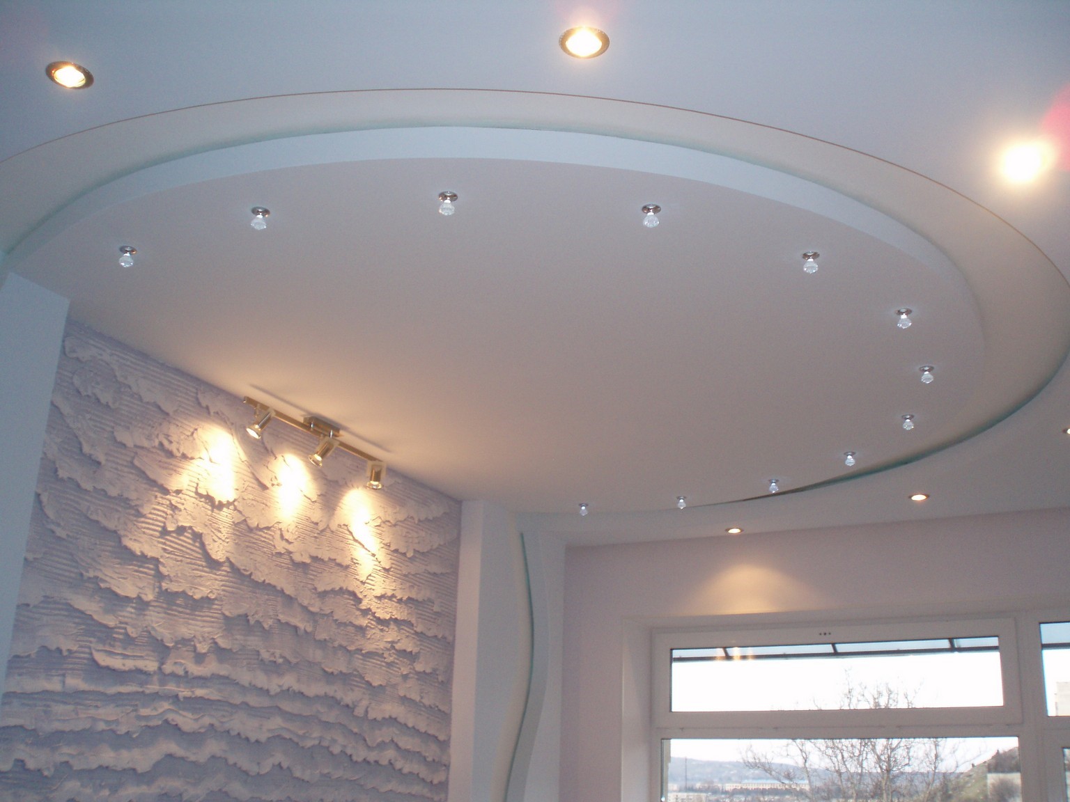Если речь идёт о двухуровневой или трёхуровневой плоскости, то точечную подсветку лучше распологать в выпуклых частях. Таким образом потолок выглядит более объёмный и не нужно жертвовать высотой потолка на основной части.