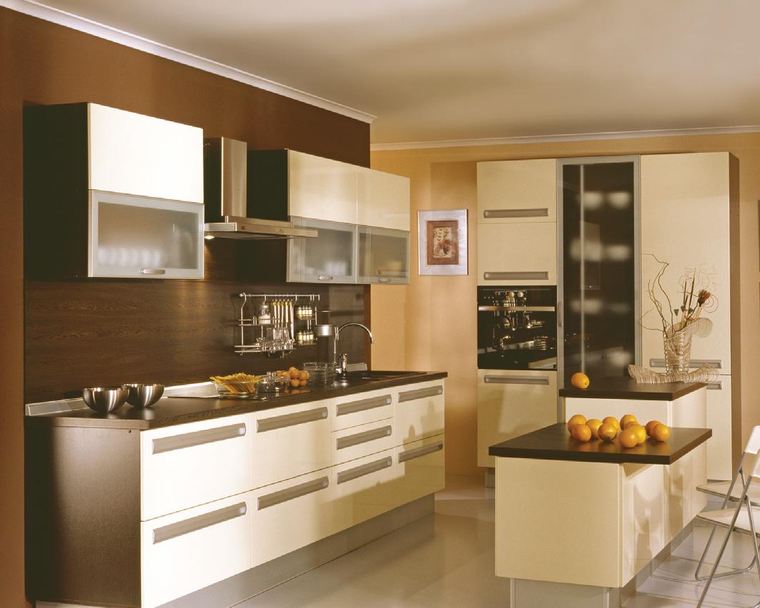 Для современных направлений характерно использование ярких и необычных колоритных сочетаний красок. Для оформления кухни в стиле модерн, можно все стены сделать светлыми, а рабочую сторону украсить ярким глянцевым цветом. Прекрасным решением будет использование фотопечати. Глянец — неотъемлемая часть стиля модерн. Он еще больше оживляет яркие цвета.