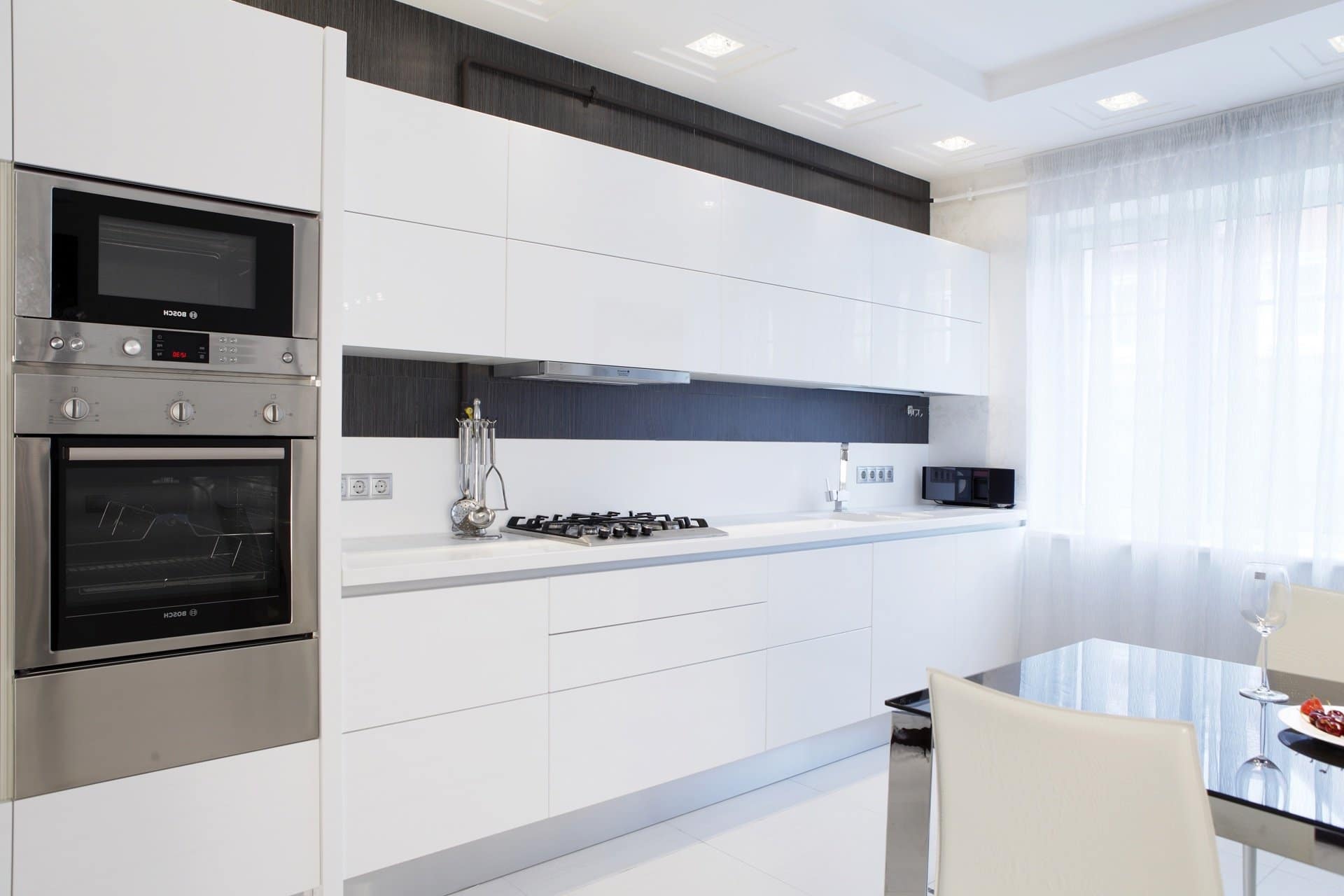 Для современных кухонь со стильной встраиваемой техникой идеально пройдет стиль хай-тек. В этом случае следует сочетать и комбинировать неяркие оттенки из одной цветовой гаммы. Фартук и столешницу лучше оформить одинаковыми отделочными материалами, желательно, чтобы их цвет также был идентичен. Для такого интерьера прекрасно подойдет черно-белая рабочая зона и аналогичная рабочая поверхность стола.