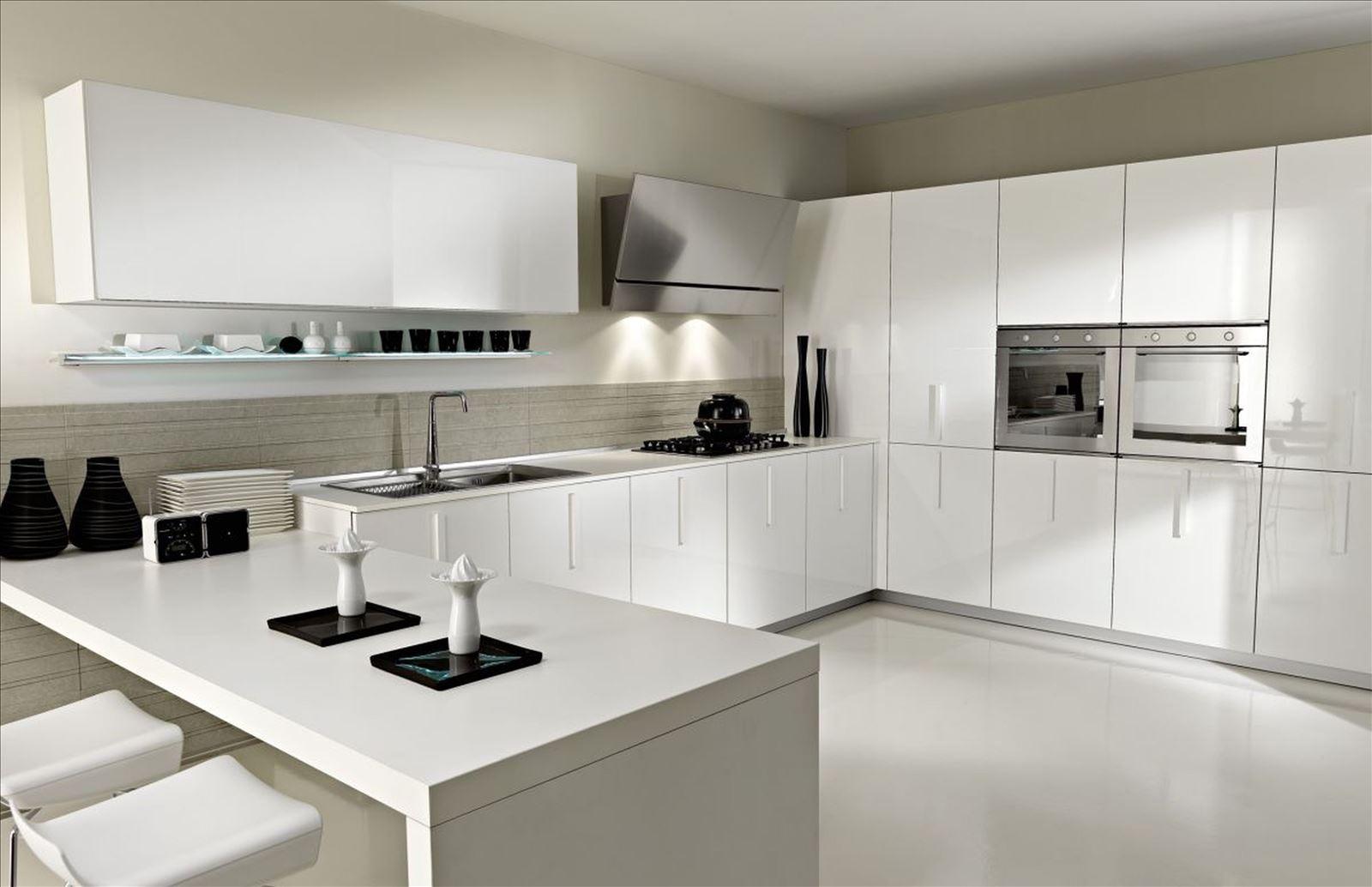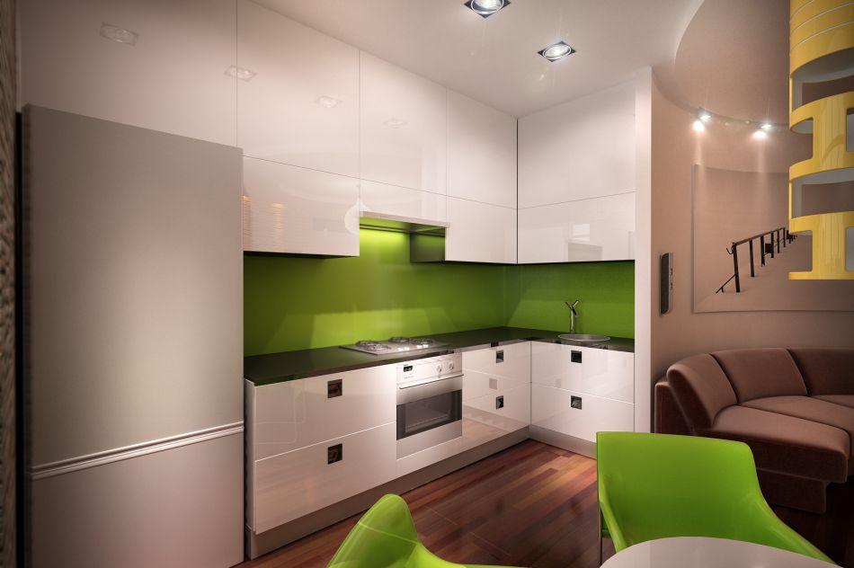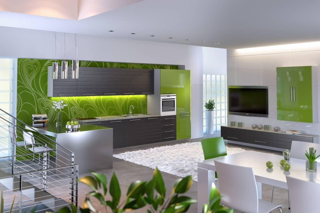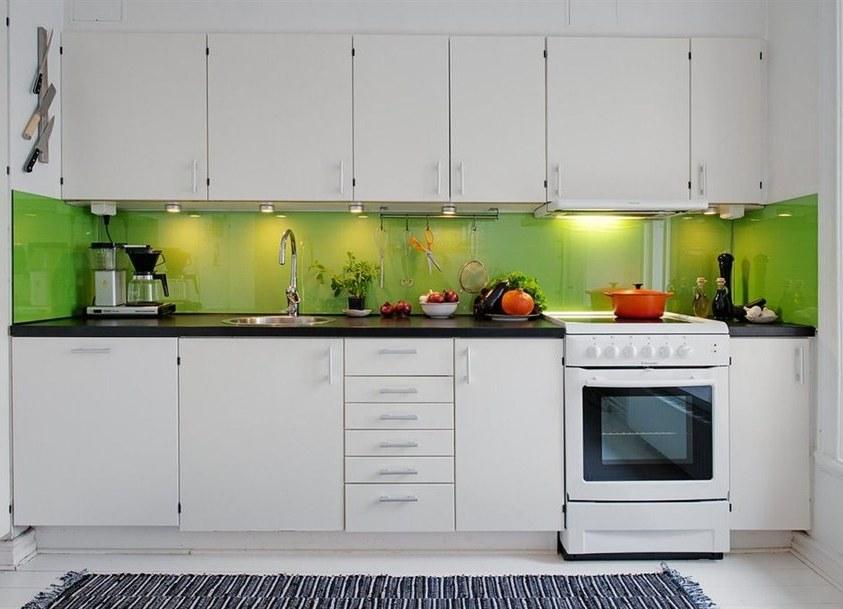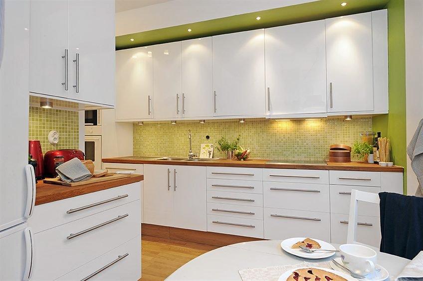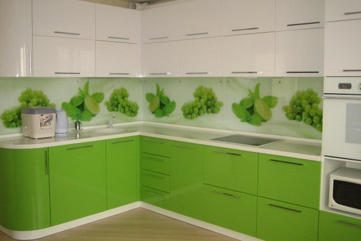 Белая кухня с фартуком салатового цвета смотрится очень стильно и современно. Еще более сочно будет выглядеть сочетание белого и лимонного цвета с глянцевым отливом для оформления рабочей зоны. Такие яркие поверхности лучше оформить стеклом.