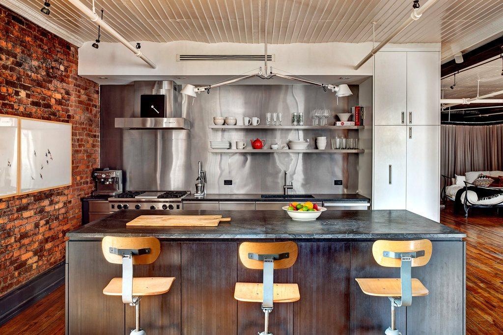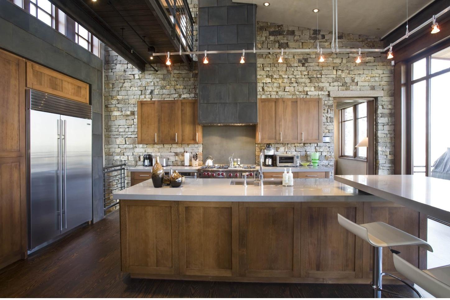 Сейчас среди дизайнеров очень актуален стиль лофт. Для отделки кухонного помещения в таком направлении лучше предпочесть имитацию каменной кладки в фартучной зоне. Это отличное дизайнерское решение для бело-коричневой кухни. Основные стены можно сделать белыми однотонными, а также бежевыми или грязно-серыми, допустим неброский орнамент, а фартук можно оформить панелями или плиткой кофейного, классического коричневого, темно-рыжего или однотонного красно-кирпичного цвета. При оформлении рабочей зоны в стиле лофт можно не бояться ярких красок, лучше отдавать предпочтение материалам с рельефной фактурой или с шершавой структурой.