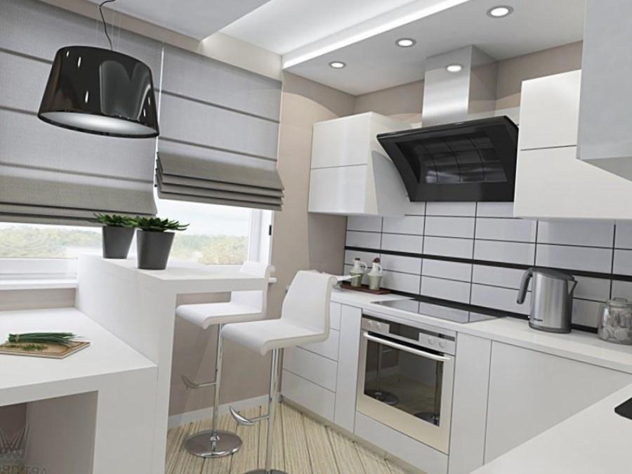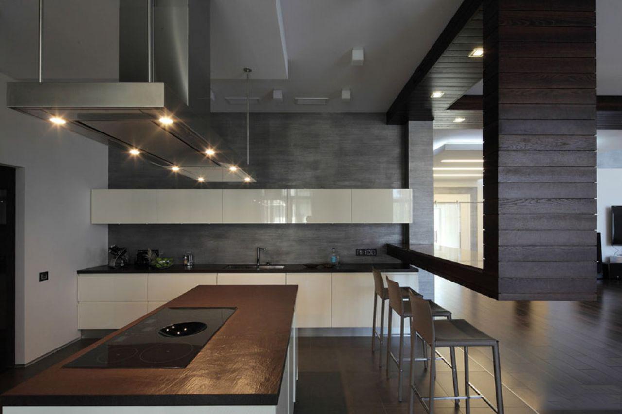 Еще одним интересным решением будет оформление кухни в стиле техно. В этом случае цвета нужно будет сочетать следующим образом. Рабочую зону необходимо оформить прозрачным стеклом с матовым покрытием или серой керамической плиткой цвета металлик. Сочетание металлического цвета фартука кухни с белыми стенами смотрится очень оригинально. Для отделки такой кухни можно использовать железные элементы декора.