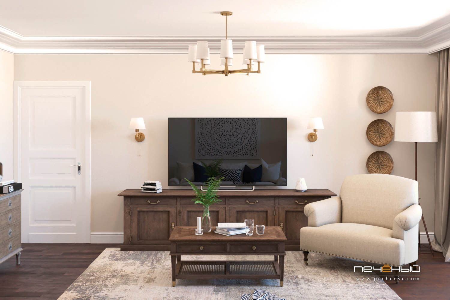 Уютная гостиная стиле Кантри. Стиль кантри — название условное. Дизайнеры работают со стилями и смыслами свободно, превращая стили в эклектичные стилизации. Так и тут: использованы приемы классического интерьера и предметы интерьера в «деревенском стиле». Шкура на полу, тёмное состаренное дерево, старый кирпич, фрески. Рядом с ретро приёмами соседствуют современная мебель и модные светильники, светодиодная торцевая подсветка и врезные светильники. Посмотреть все комнаты этого интерьера в портфолио