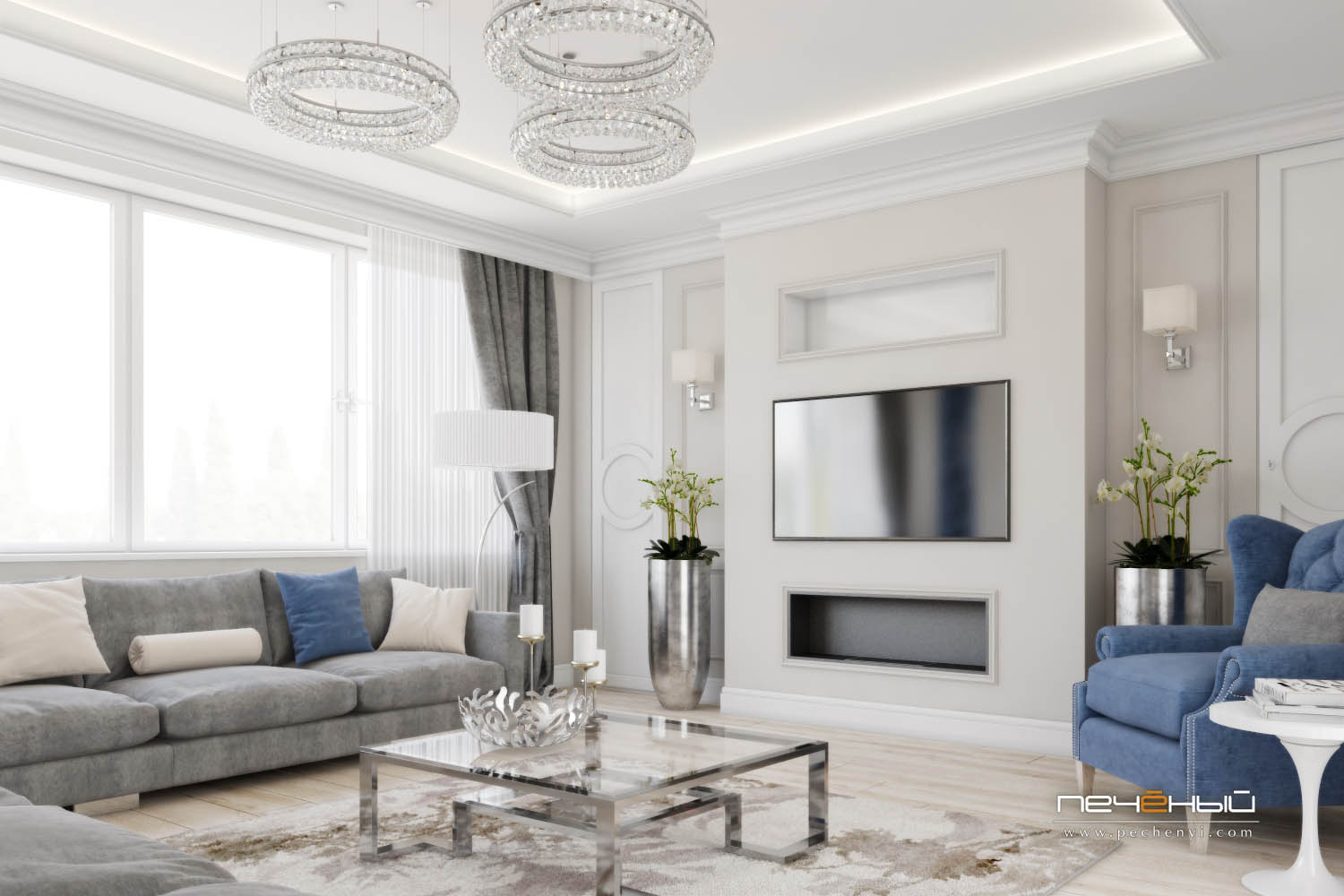 При выборе основного элемента гостиной (телевизор, камин, стол) важно учитывать его размер. Он должен органично вливаться в общий дизайн