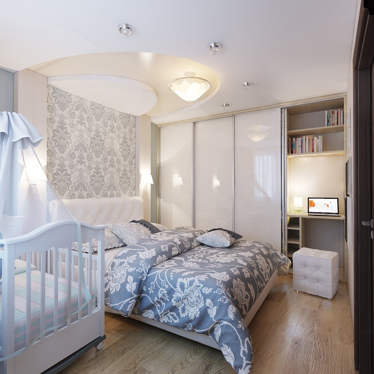 Обратите внимание на детские кроватки, которые приставляются к кровати взрослых. Так вы сэкономите место и обеспечите себе удобство в заботе о малыше в ночное время
