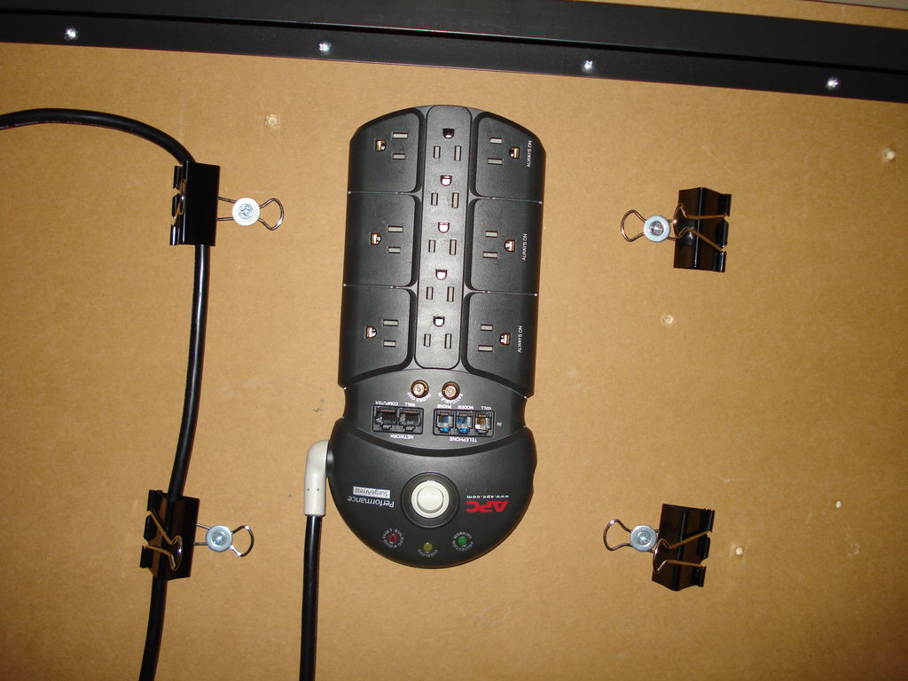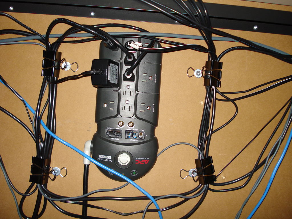 Чтобы закрепить провода и удлинитель под столом, вам понадобятся биндеры и шурупы (по длине они должны быть хотя бы на четверть меньше толщины столешницы, иначе пройдут насквозь и стол будет испорчен). Первым делом закрепите под столешницей удлинитель, лучше в середине стола или ближе к стене. Затем в нужных местах закрепите биндеры с помощью шурупов. Подключите к удлинителю всё необходимое и соберите провода зажимами. Визуально стол стал намного чище и аккуратнее.