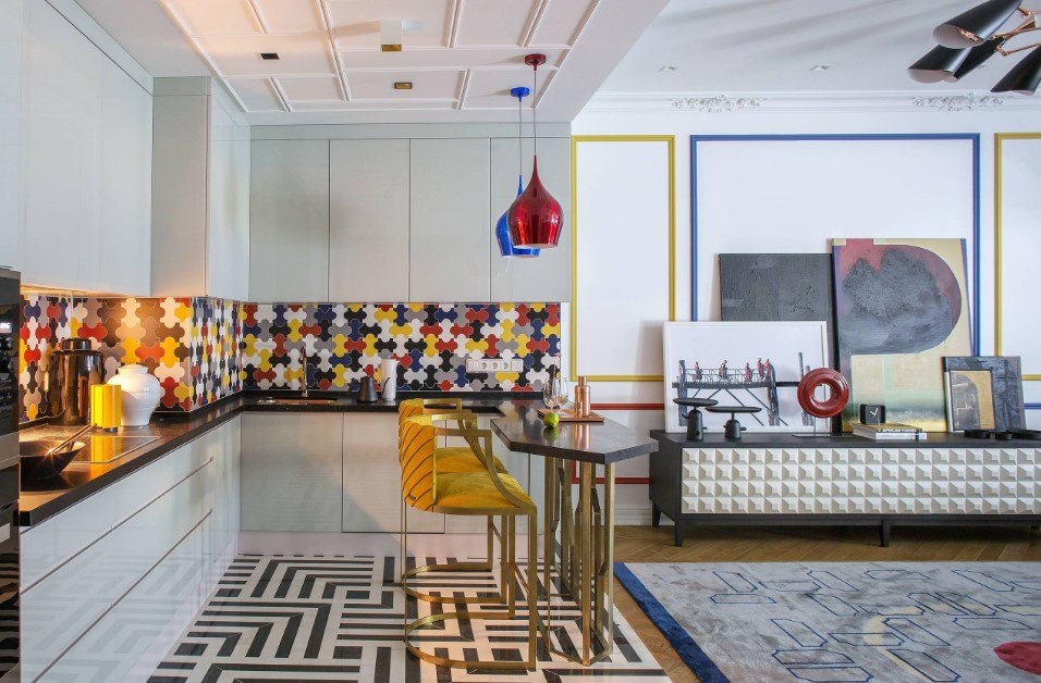 Например, фон кухни формируется из двух цветов: белого и черного, матового и глянцевого. В данном случае, к белому матовому гарнитуру подбирается черный глянцевый фартук. При этом выполняется в белом цвете потолок, а стены и пол выполняются в темном цвете.