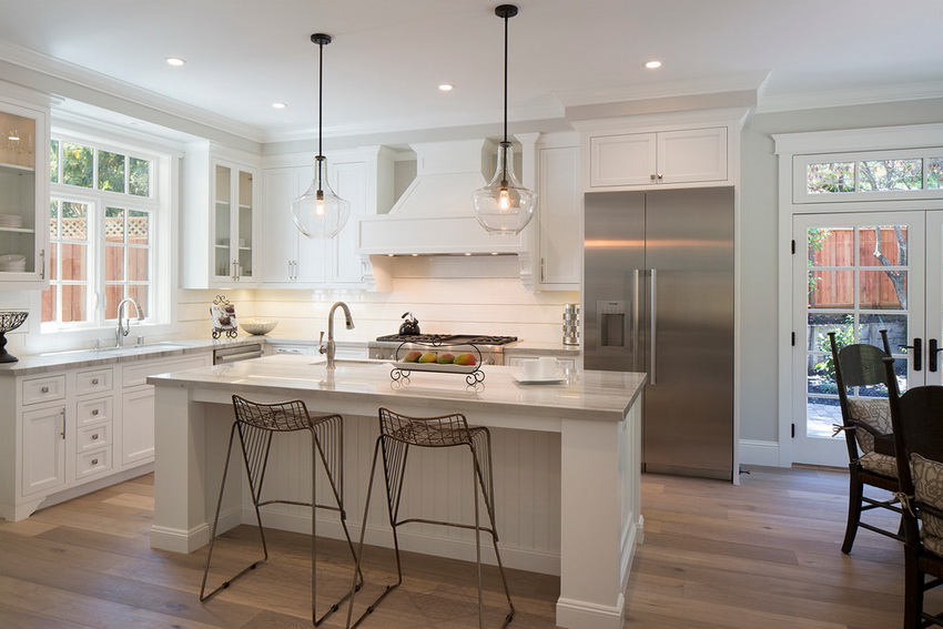 Кухня в стиле прованс — просторная, светлая, часто объединенная со столовой. Уголок для готовки отделяется от обеденной зоны столешницей или островной барной стойкой. Перед дизайнерами стоит непростая задача, ведь необходимо гармонично вписать бытовую технику в классический, деревенский интерьер так, чтобы она не выглядела неуместно. Для этого современные предметы часто прячут в шкафчики или маскируют под старинные.