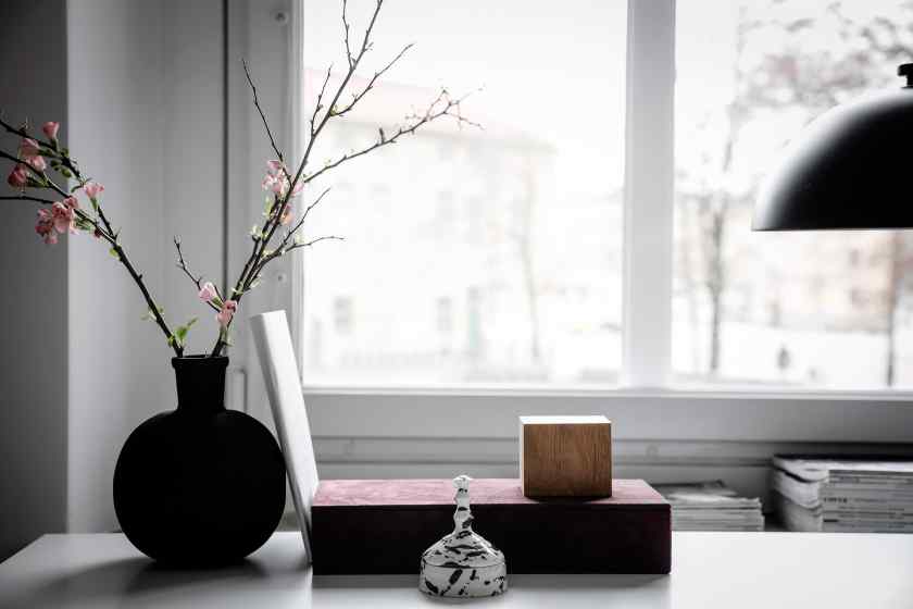 Чтобы интерьер в стиле минимализм не получился слишком строгим, его можно разбавить креативными полочками, доской для записи важных заметок или просто оригинальной настольной лампой.