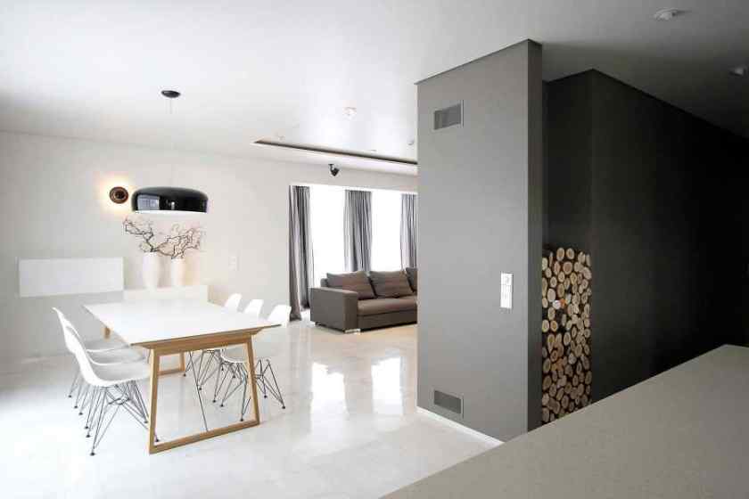 Для оформления интерьера дизайнеры использовали типичные для минимализма цвета – теплый серый и белый, которые разбавили желтыми акцентами в текстиле. Характерные особенности минимализма в квартире – монохромная палитра, минимум декора, открытое пространство с окнами в пол и встроенная мебель. Яркий акцент – крупноформатная фотография французского сюрреалиста.