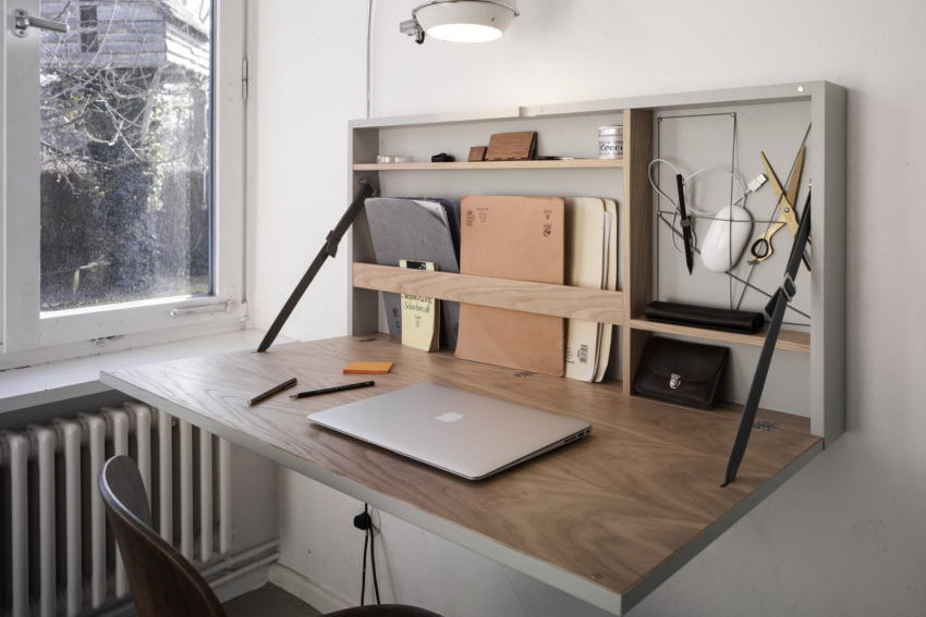 - Скрытый стол. Это очень компактный предмет мебели, который обычно маскируется в интерьере комнаты под другой элемент. Чаще всего, конструктивно он представляет собой откидную столешницу и удобным механизмом раскладывания. В сложенном виде он будет напоминать небольшой шкафчик, а в разложенном полноценный рабочий стол. Такой вариант является прекрасным решением для интерьера маленькой комнаты. В случае необходимости его всегда можно сложить, чтобы увеличить полезную площадь комнаты. Главным недостатком является то, что необходимо решать, куда убрать предметы и вещи со стола, когда он сложен.