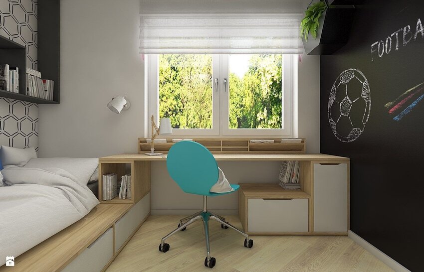 Проект современной меблировки комнаты подростка с компактным креслом на колесиках и ярким столом
