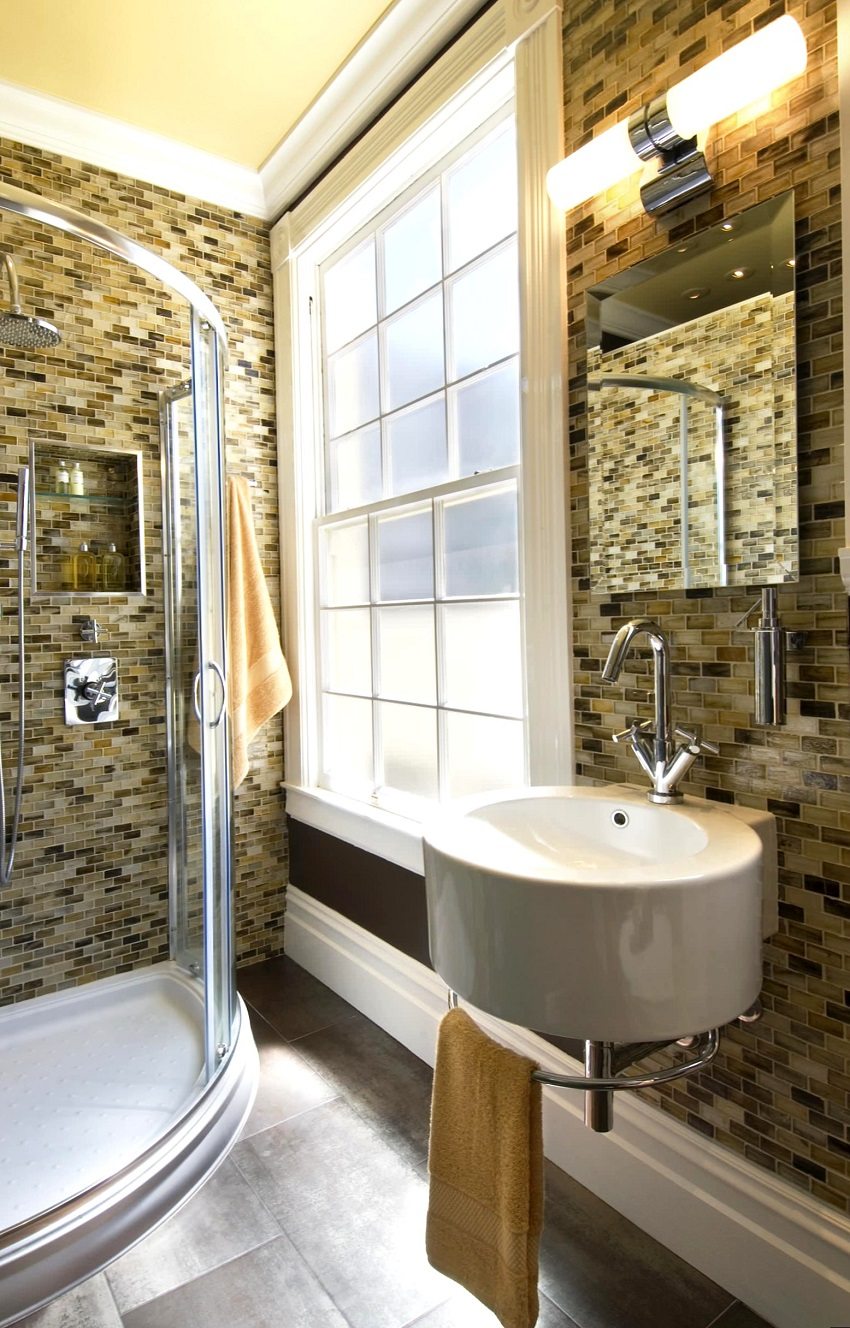 - матовое стекло или полотно с узором скрывает человека, принимающего душ, от посторонних глаз.