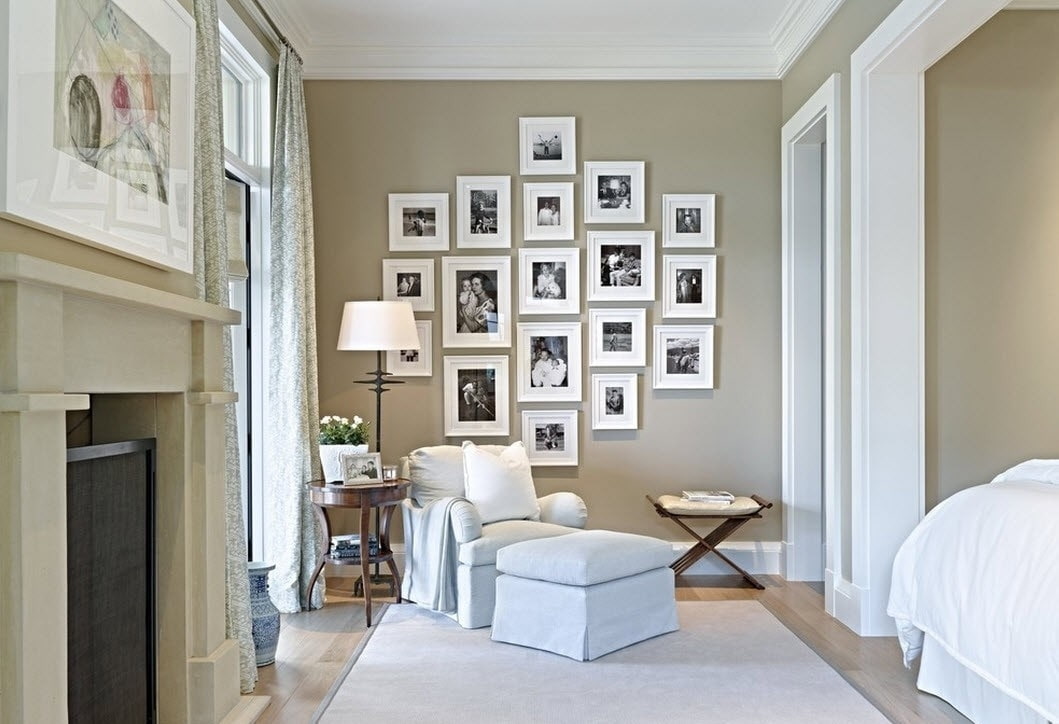 Фотографии можно разместить в любой комнате в частном доме или квартире. Основное правило: стиль оформления должен соответствовать дизайну помещения, гармонировать по цветовой гамме и общему восприятию. Можно пойти простым путём и купить одинаковые рамочки для всего панно, в таком случае их следует размещать как плитку по всей поверхности стены.
