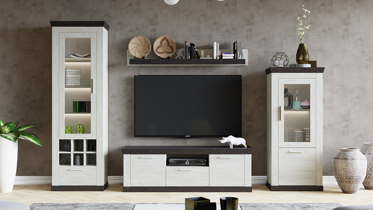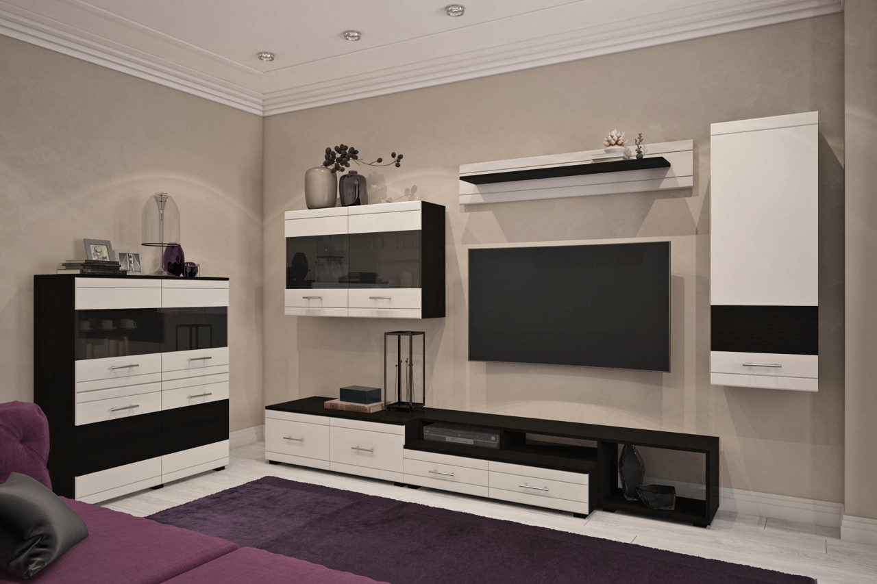 Стенка может быть представлена длинной напольной тумбой небольшой высоты, выполняющей роль подставки для телевизора. Также в комплект могут входить различные навесные шкафы и полки.