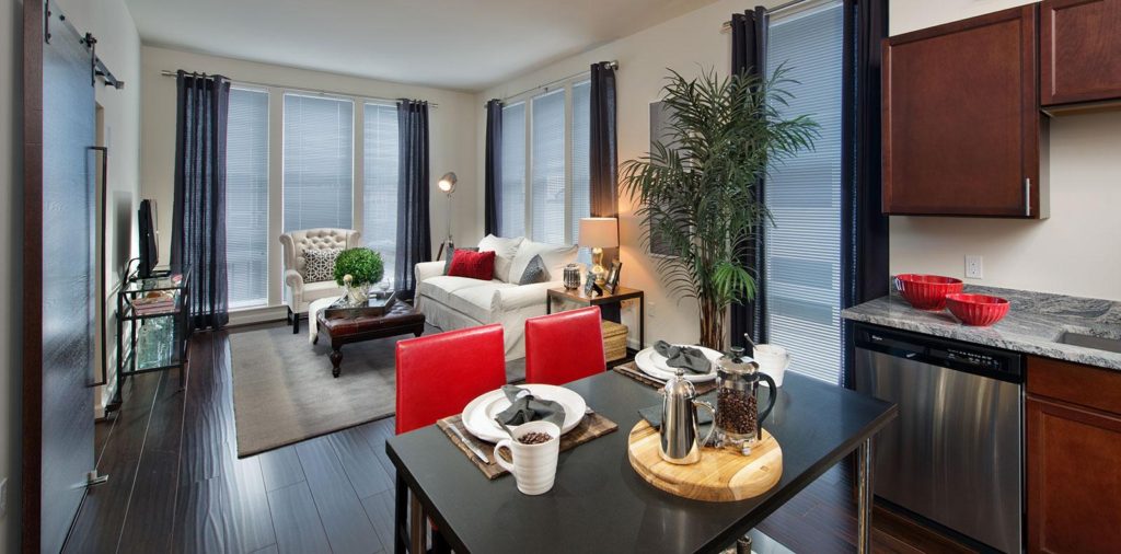 Также для интерьера характерно использование раздвижных дверей, фасадов, открывающихся нажатием руки, встроенных в стены технических устройств, управляемых с помощью пульта. Даже мобильные перегородки могут выполнять сразу несколько функций: зонировать помещение, заменять собой доску для совещаний или напоминаний.