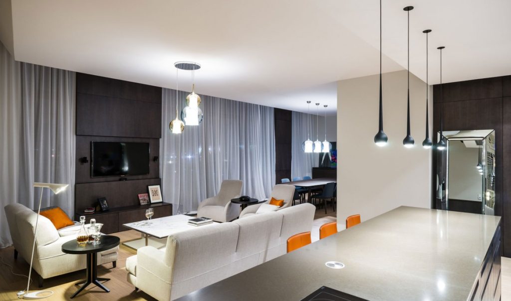 На фоне матовой стены будет хорошо смотреться заливной глянцевый пол. Создадут креатив и футуристический образ подвесные шкафы и замысловатые лампы. Любители кино и качественной музыки могут в гостиной установить аудиосистему. Барная стойка создаст параллель между местом приготовления пищи и гостиной.