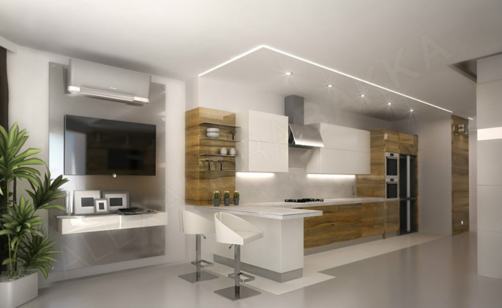 Натяжные или подвесные конструкции обычно проектируются вместе с системой освещения комнаты. Высокотехнологичный потолок обязательно должен иметь кроме центрального источника света, точечные светильники или разноуровневое освещение.