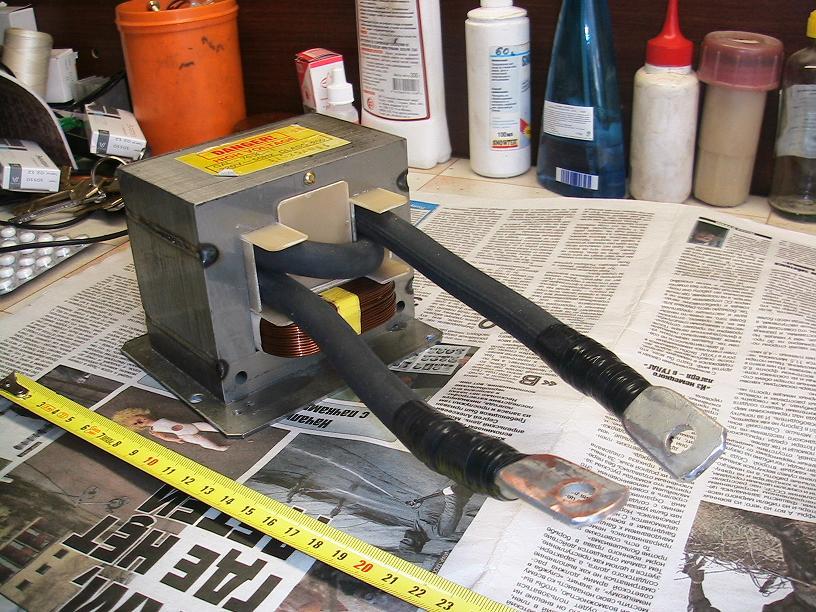 Основной частью контактного сварочного агрегата является силовой трансформатор. Для обеспечения высокого сварочного тока он должен иметь достаточный коэффициент трансформации. Трансформатор, питающий магнетрон в микроволновой печи, полностью подходит для таких целей, если его мощность не менее 1 кВт.