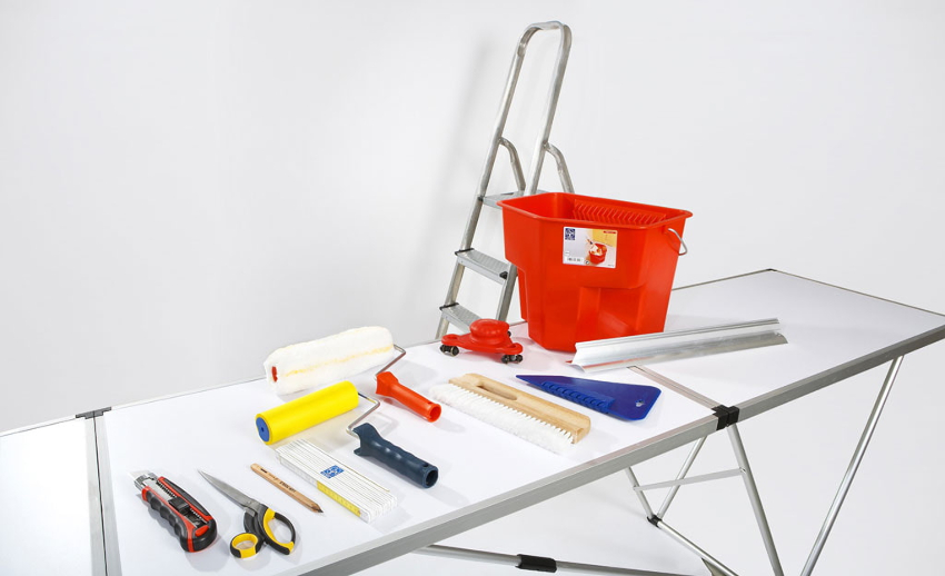 Для поклейки обоев также понадобится определенный набор инструментов, состоящий из предметов, которые чаще всего есть в любом доме. Докупить придется буквально несколько компонентов. Ниже приведен список приспособлений, которые потребуются для поклейки флизелиновых, виниловых и других видов обоев: