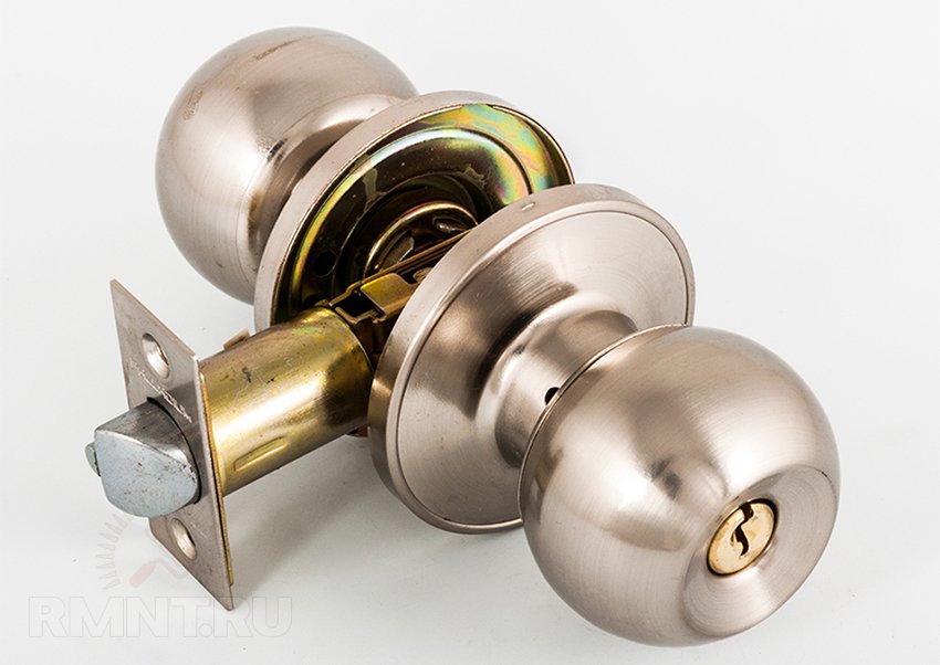 Кнобы с замком можно закрыть и открыть снаружи — не спицей, а с помощью ключа. Изнутри работает поворотный механизм открывания и фиксации. Ручки этого вида часто используются для врезки в двери коммунальных квартир и гостиниц.
