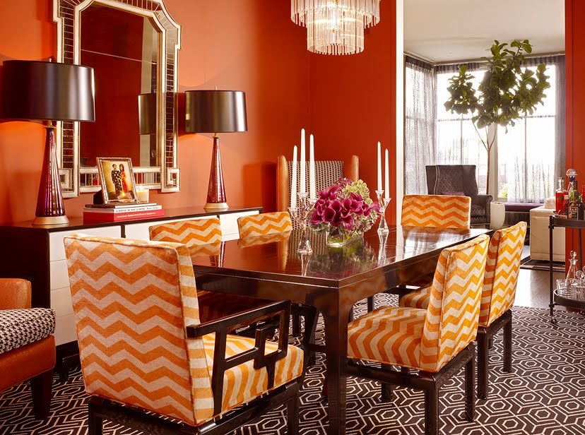 Этот темный оранжевый тон будто излучает особое свечение и напоминает застывшую смолу. В гостиной или кухне квартиры, оформленной в стиле современная классика, можно использовать стулья с янтарной обивкой и вращающимися латунными основаниями.