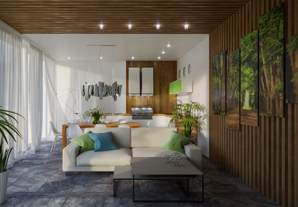 Экостиль в интерьере гостиной предполагает сочетание натуральных материалов и растительности
