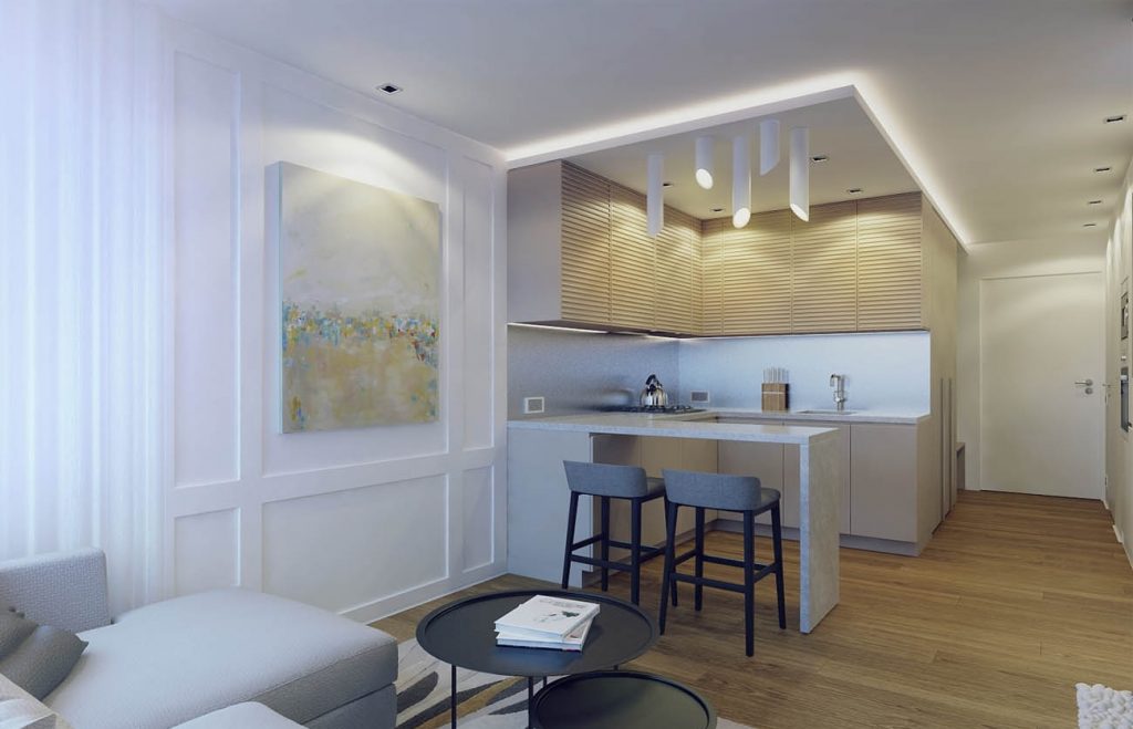 В небольшом помещении квартиры студии, подобное решение поможет грамотно и без особых затрат разделить пространство. Вмонтированные осветительные приборы дают возможность создать различную интенсивность освещения в разных зонах многофункционального помещения.