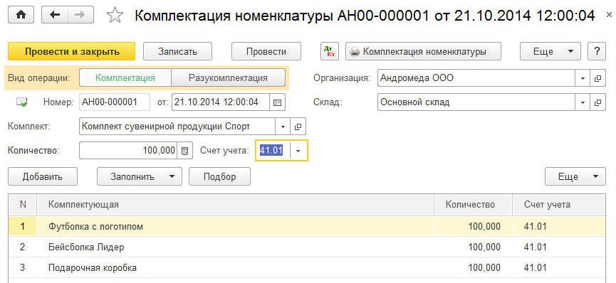Подробнее об операции по комплектации номенклатуры см. в «Справочнике хозяйственных операций. 1С:Бухгалтерия 8» в разделе «Бухгалтерский и налоговый учет» ИС 1С:ИТС.