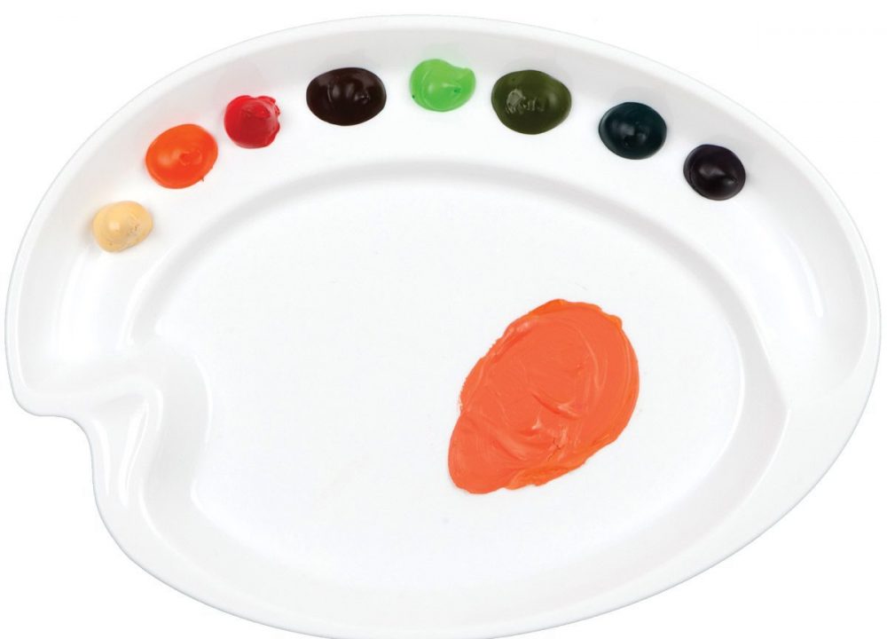 Соединять гуашь, акрил, акварель, водоэмульсионку, масло, строительные краски можно на белой палитре – именно так детально просматривается готовый оттенок. Если палитры нет, используют белую фаянсовую тарелку, в крайнем случае – белую одноразовую (пластиковую) посуду или бумагу.