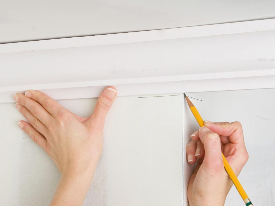 - Прикладываем каждую деталь торцом в угловой части помещения и чертим на потолке карандашом очертания заготовки.