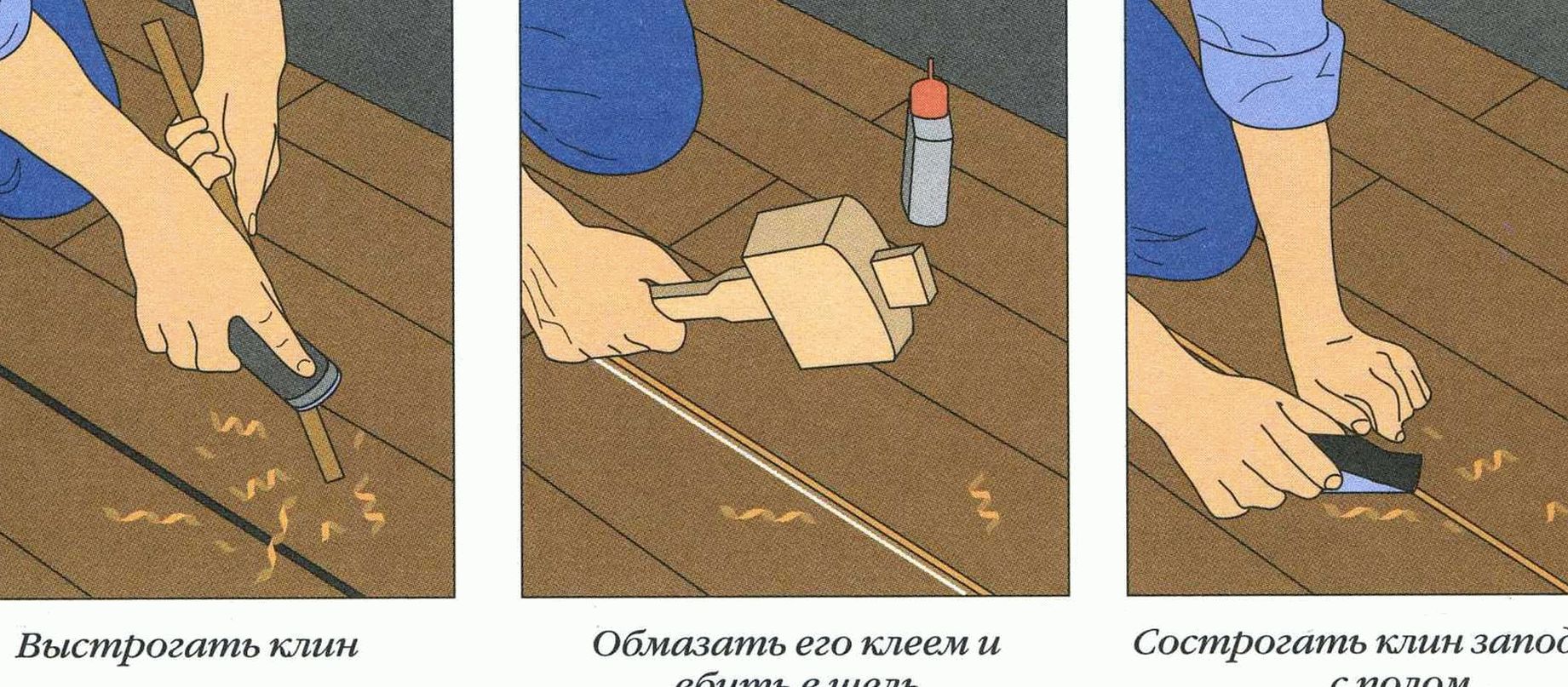 Более сложным является метод устранения щелей при помощи реек и клиньев. Эти детали нужно заранее подогнать — они не должны распирать доски.