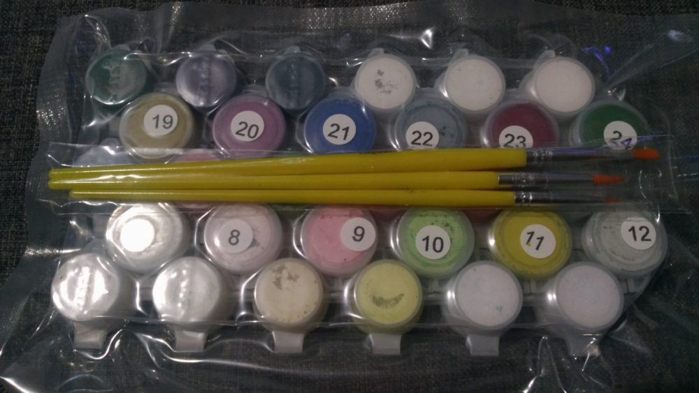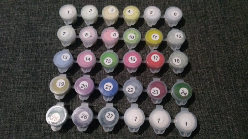Тара кажется небольшой, но содержимого хватает для завершения работы. Краску разводить не нужно. Но есть комплекты, в которых для получения правильной картины колеры приходится смешивать, создавать оттенки. Номера на емкостях соответствуют указанным на полотне. В некоторых комплектах для рисования есть еще банка без номера. Обычно это черный или иной густо-темный колер, которым закрывают непронумерованные секции.