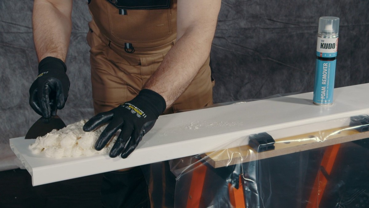 С линолеума, ламината и паркета пену снимают острым предметом и удаляют остатки специальным очистителем. Средство не должно содержать ацетон, иначе на напольном покрытии останутся матовые следы.