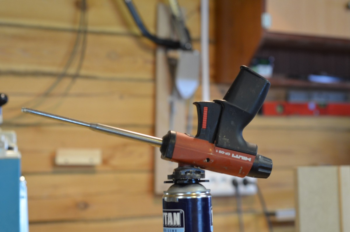 Баллон очистителя накручивается в штатное место монтажного пистолета. Затем путем нажатия на курок она прогоняется через рабочие механизмы оборудования, тем самым прочищая выходное отверстие и прочие внутренние детали пистолета.