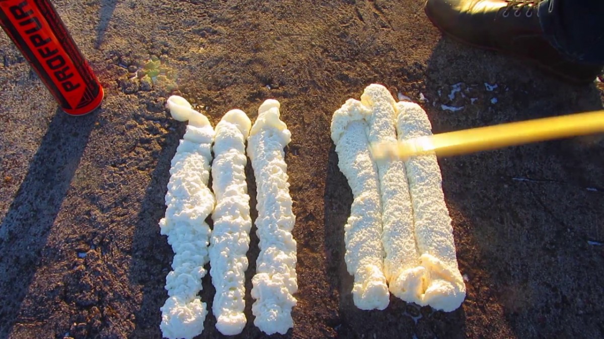 Морозостойкая пена. При полимеризации стандартной пены, проходящей при минусовых температурах, свойства этого материала несколько изменяются – она становится хрупкой и осыпается при малейшем прикосновении. По сути, это уже не герметик, и функцию свою он не выполняет. Для работы при минусовых температурах существует морозостойкая полиуретановая монтажная пена – она имеет предел устойчивости к холоду, который в среднем составляет -10˚C. Отдельные экземпляры позволяют выполнять работы по герметизации при температуре до -25˚C.