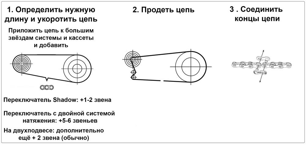 Необходимое число звеньев можно узнать, сравнив старую и новую цепь, но не всегда длина изначально правильная, поэтому лучше измерить заново. Делается это достаточно просто: нужно приложить цепь к самым большим звёздам системы и кассеты и добавить некоторое количество звеньев.
