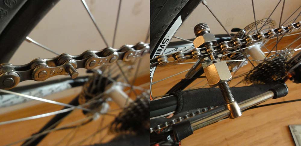 Здесь нужно сказать, что на трансмиссии от 10 скоростей и более, лучше использовать замок (либо специальные «одноразовые» пины с обламывающимся носиком). Дело в том, что чем больше звёзд в кассете, тем меньше расстояние между звёздами и тем тоньше должна быть цепь. В цепях менее 10 скоростей, пины длиннее ширины внешнего звена и чуть торчат из пластин, благодаря чему имеют некоторый запас прочности. А чтобы уменьшить толщину цепей на 10+ скоростей, пины в них делают короче – вровень с пластинами. Когда такой пин выдавливается из пластины, обычно его кромка откалывается в виде маленького колечка и повторное соединение им будет ненадёжно.
