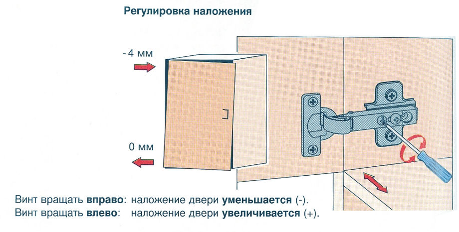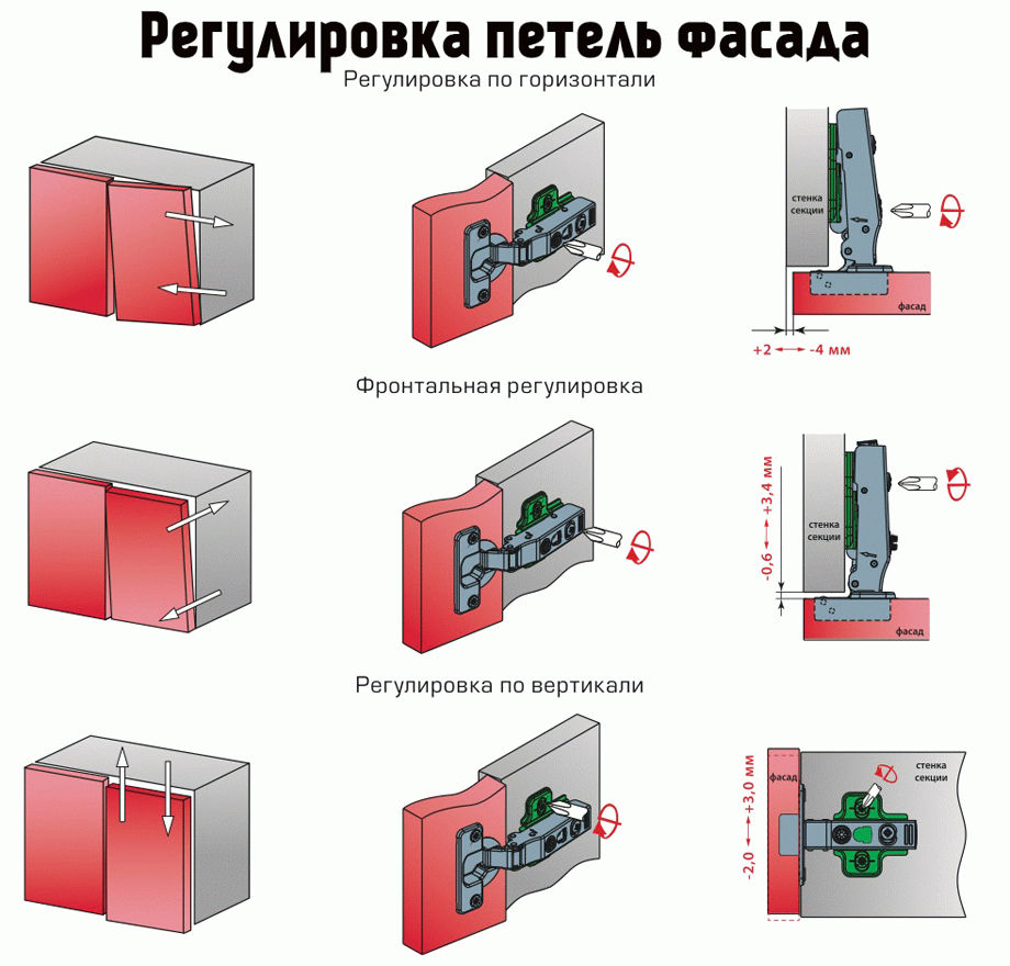 Перед настройкой петель на дверных полотнах шкафа, необходимо решить, по какому принципу будет выполняться работа. Существует несколько видов регулирования: