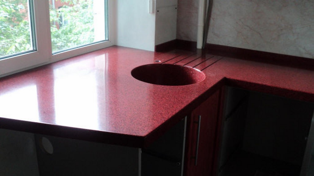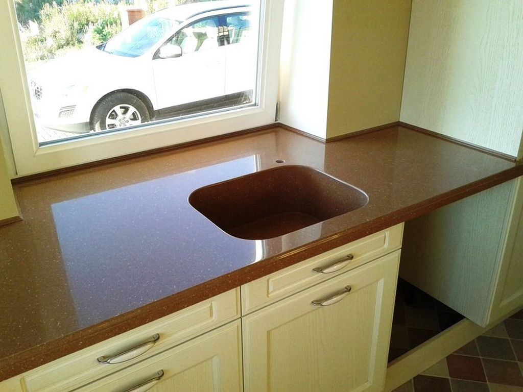 Подоконник столешница из акрилового камня состоит из смолы, наполнителя, красителя, чаще всего имитирует природный материал. Готовая доска гладкая, без швов, простая в обработке. Акрил не впитывает жир и влагу, служит долго.