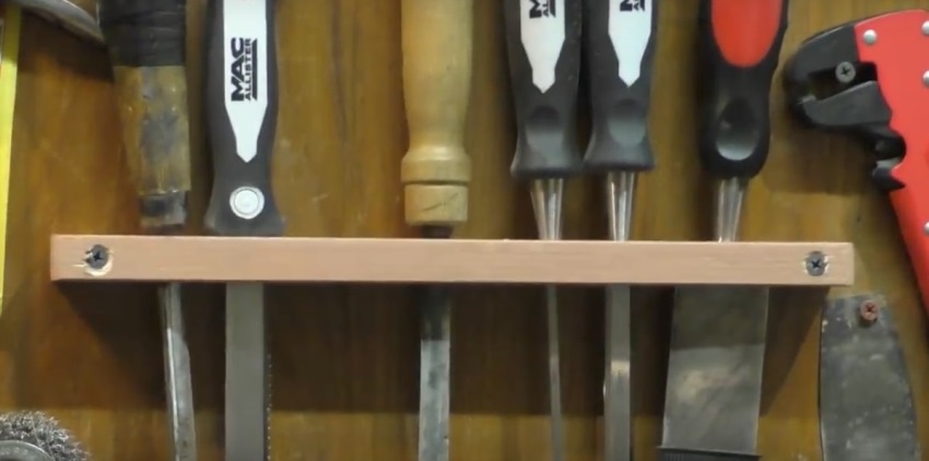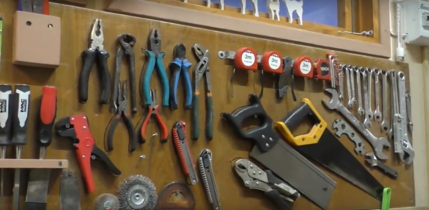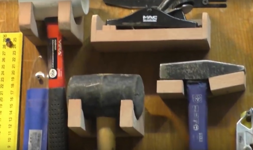 Наличие подобного стенда избавляем мастера от необходимости лазать по различным ящикам, чтобы найти какой-то необходимые ему инструмент. Все инструменты всегда находятся на виду. В длинном описании такая самоделка не нуждается, на нее достаточно лишь взглянуть, чтобы воспроизвести нечто подобное.