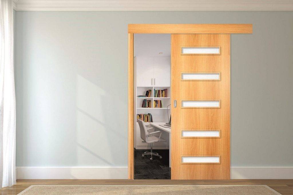 Большинство производителей наладили выпуск встроенных раздвижных дверей, в которых адаптирована кассета под размер проема для двери от 60 до 100 см. В комплект входит готовый пенал и направляющий механизм, на котором уже установлена каретка с роликами. Остается только смонтировать все в проем и навесить дверное полотно.