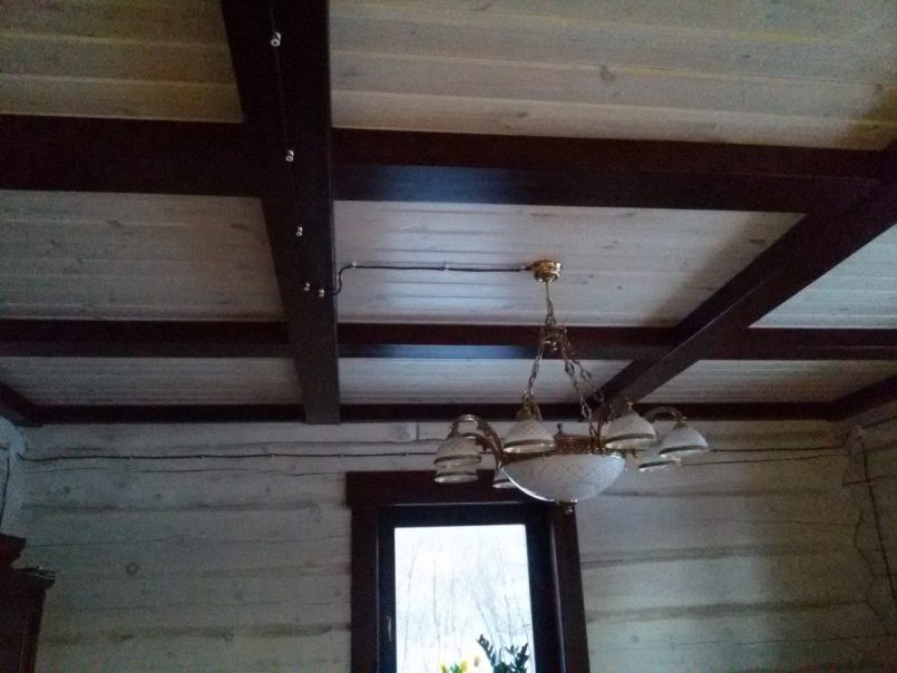 Часть линий по возможности прокладывают скрытым образом — под деревянным полом, в электрическом плинтусе и за подшивным потолком. Это позволяет применить недорогие стандартные кабели нужного сечения. Их доводят до распределительных коробок, а далее опускают к электроточкам декоративные провода открытым способом на изоляторах.