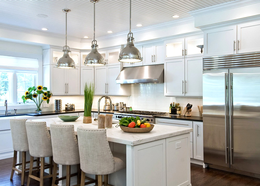 Выбор светильника определяется исходя из личных предпочтений, стилистики помещения, бюджета и типа потолочного покрытия. Для традиционного крашеного или побеленного потолка применяются потолочные или подвесные люстры либо светильники. Для гипсокартонной или реечной конструкции, которая крепится на некотором расстоянии от основания, подойдут любые виды осветительных приборов, начиная от обычных изделий и заканчивая встроенными системами освещения. Разные варианты показаны на фото светильников на кухню.