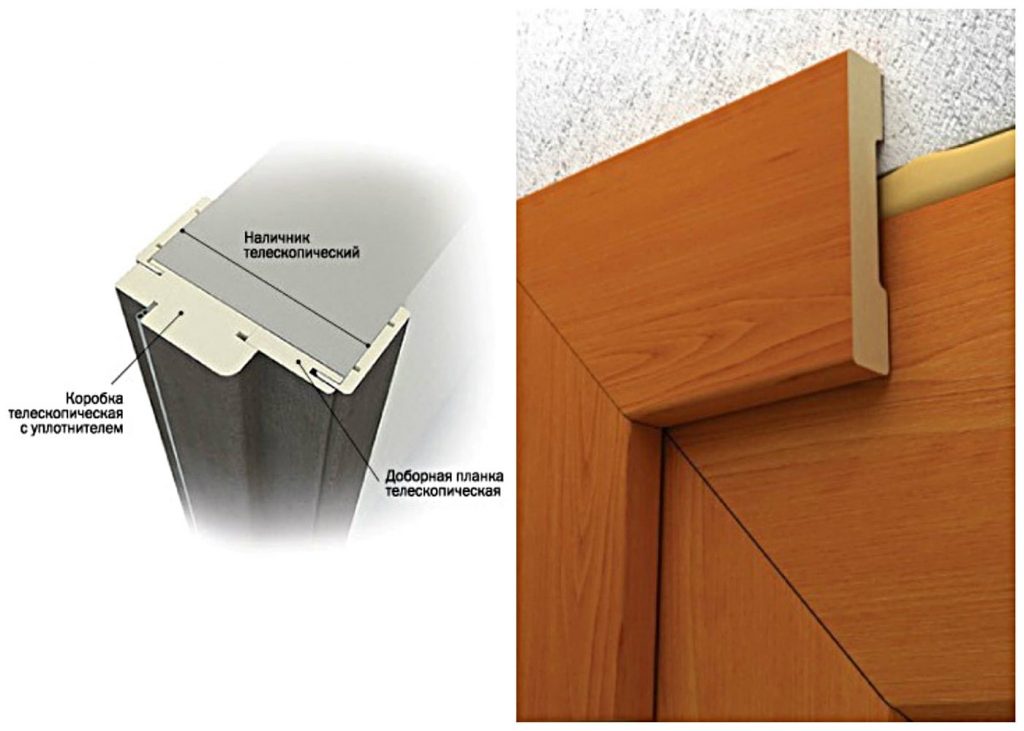 Доборы устанавливаются только в случае, если толщина стены намного больше толщины коробки двери. Если же толщина стены больше на 2-3 см то, можно обойтись без доборов, но понадобятся телескопические наличники. Они изготовлены в виде уголка и позволяют закрыть собой часть стены. Кроме того, коробка должна быть адаптирована под такого вида наличники, в ней должны быть необходимые пазы.